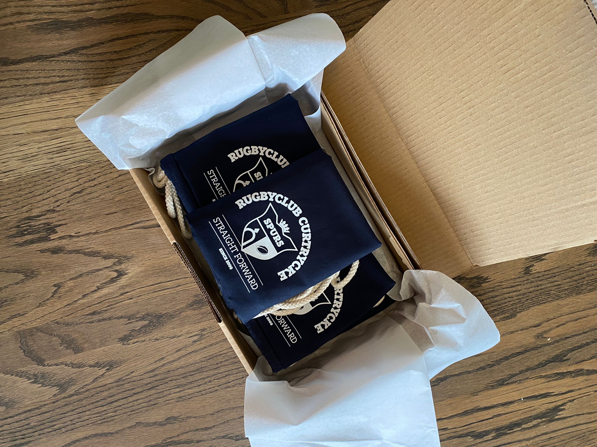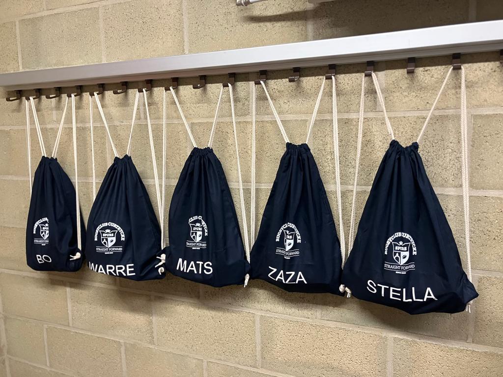 - turnzakjes voor rugbyclub (alle speelsters die mama worden krijgen zakje met naam van kindje + logo van de club)
