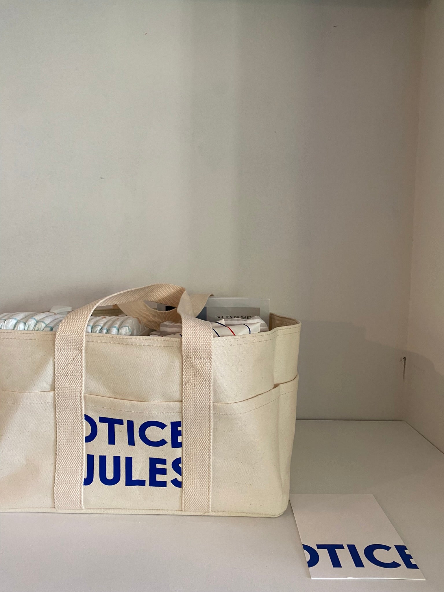 - een luiertas gepersonaliseerd op basis van geboortekaartje van het 2e kindje en naam van eerste kindje ook toegevoegd in zelfde stijl