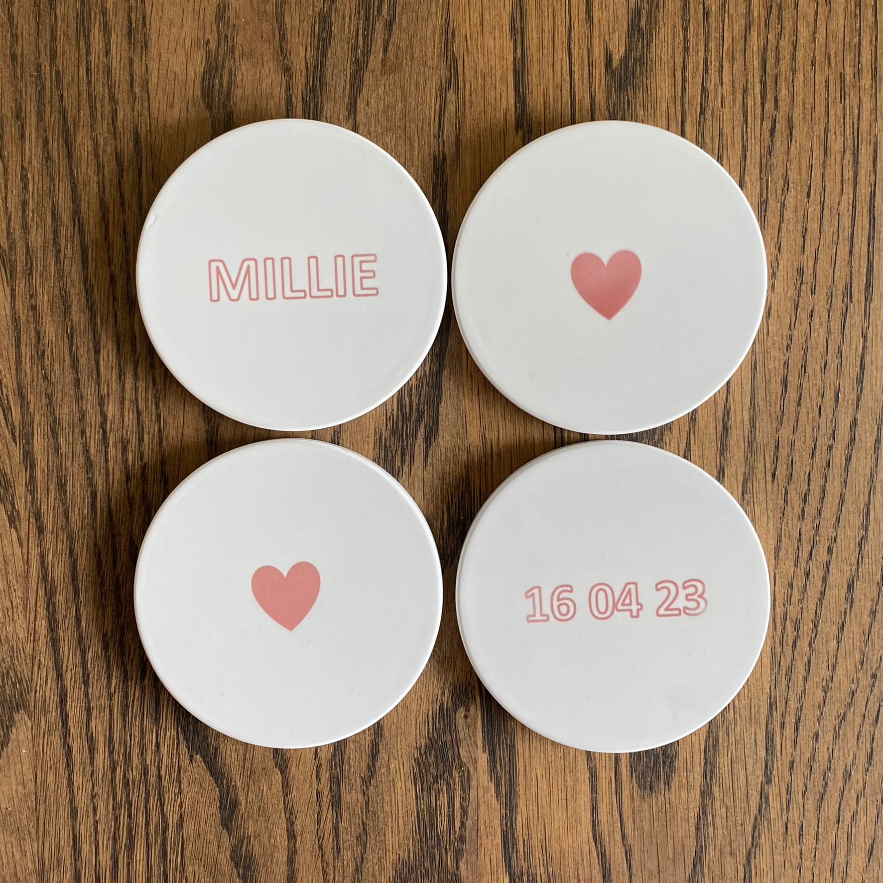 - onderzetters met naam kindje en geboortedatum als cadeautje voor babyborrel