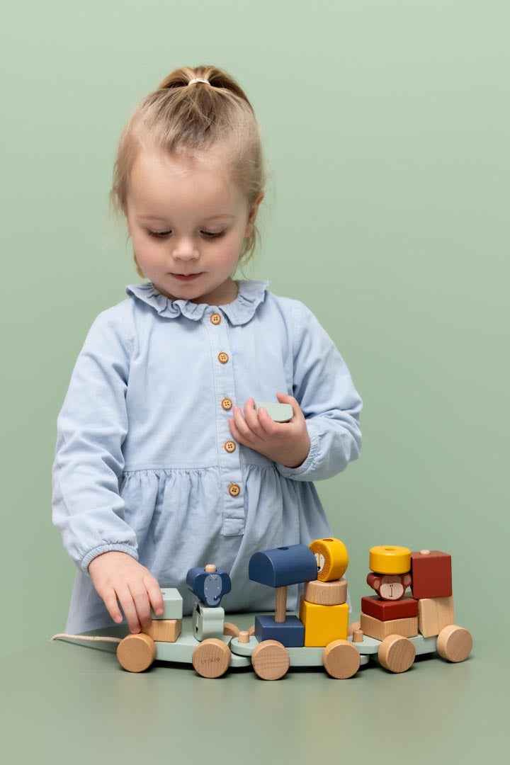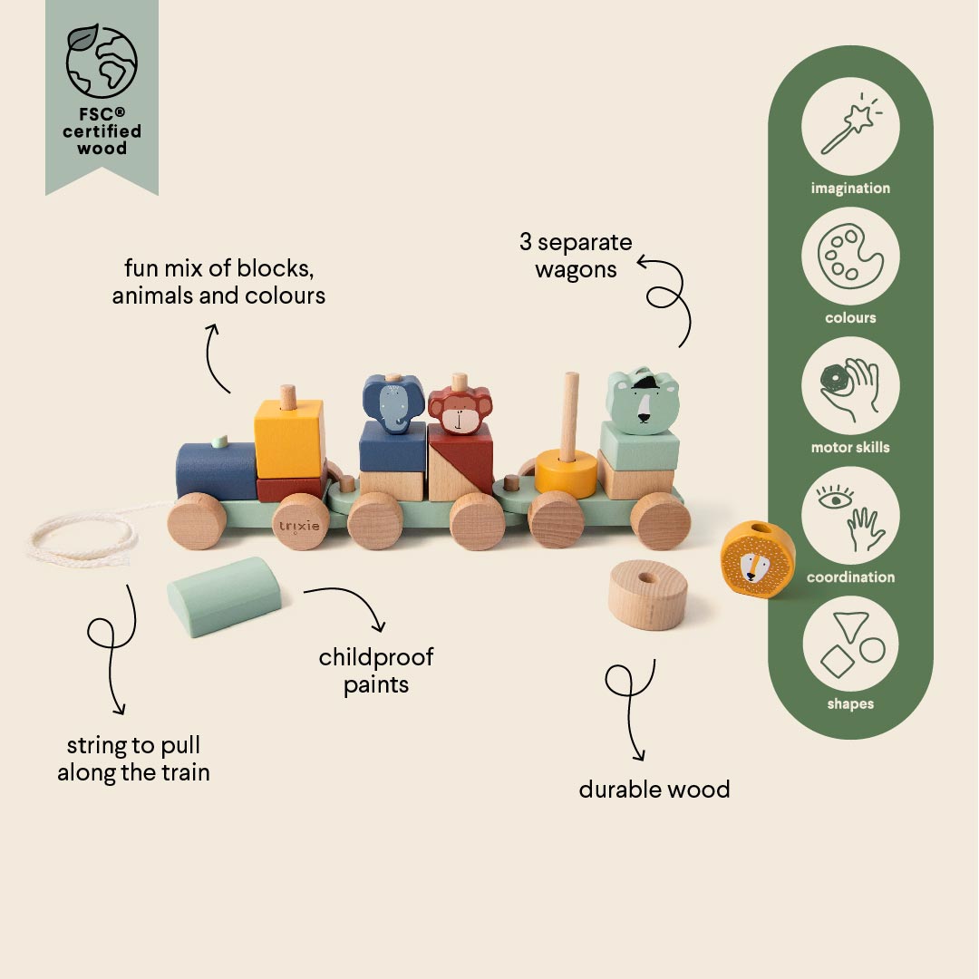 Spring op de trein met onze dierenvrienden! Met alle verschillende blokken in verschillende kleuren, kun je je eigen wagons maken. Gebruik het touwtje aan de voorkant om je trein mee te trekken op de leukste avonturen! De trein en al zijn elementen zijn gemaakt van 100% FSC ® gecertificeerd hout. Alle verven zijn op waterbasis en veilig voor baby's.