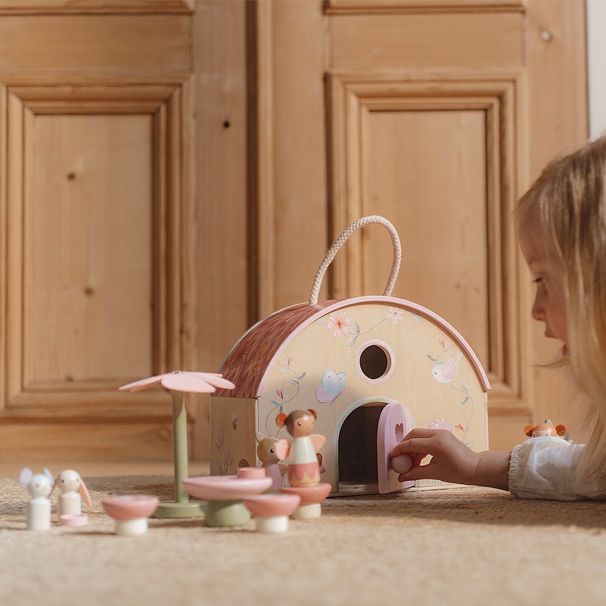 Welkom bij het feeën huisje! In Fairy Garden, hier ver vandaan, waar de mooiste bloemen bloeien, dartelen en dansen de liefste feetjes. Dit schattige poppenhuis is een magisch toevluchtsoord voor betoverende speelavonturen. Het is versierd met bloemen en schattige boswezentjes. Het lieve figuurtje, met uitgestrekte vleugels, brengt het poppenhuis tot leven. Haar deur staat altijd open en de stoelen, ronde tafel en parasol staan klaar om samen met haar vriendjes te kunnen picknicken en kletsen. En na een dag vol spelen, vouw je het poppenhuis weer dicht, klaar voor het volgende betoverende avontuur. Dit schattige huisje is het perfecte decor voor eindeloze uren fantasierijk spel en sprookjesachtige dromen.